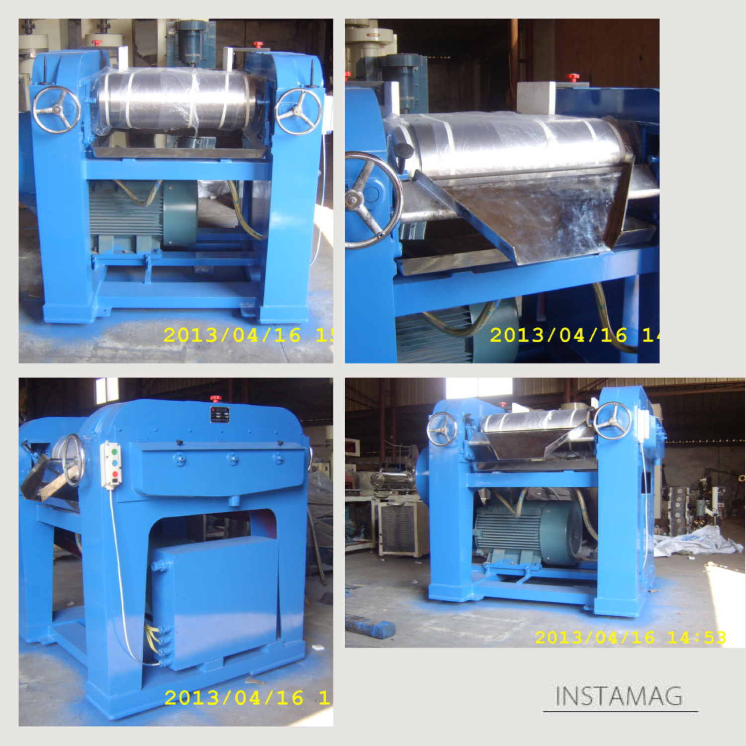 三輥研磨機(jī)適用于細(xì)度要求較高的膏體或高粘度物料使用。該機(jī)通過水平的三根輥筒的表面相互擠壓,手動(dòng)式調(diào)節(jié)輥筒之間的間距,以不同速度的摩擦達(dá)到研磨效果。可裝有緊急制動(dòng)按鈕,防止落入異物導(dǎo)致的設(shè)備損壞。輥?zhàn)邮褂锰厥庥操|(zhì)合金澆鑄而成;也可以使用大理石材質(zhì)。傳動(dòng)采用鏈條傳動(dòng)、齒輪調(diào)輥。